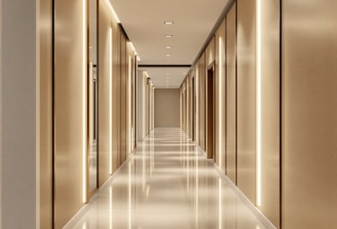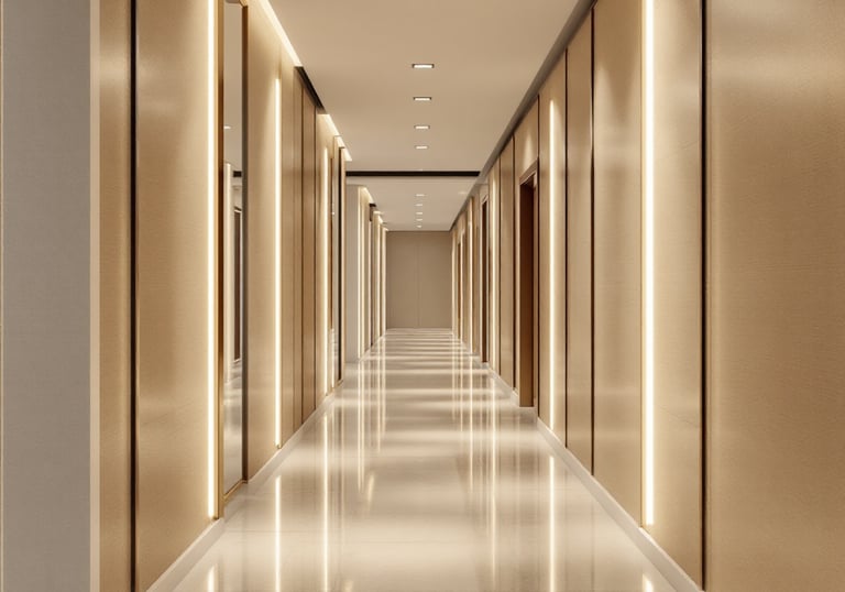 (hall/row de entrada, recepção, corredores, salas de reunião)